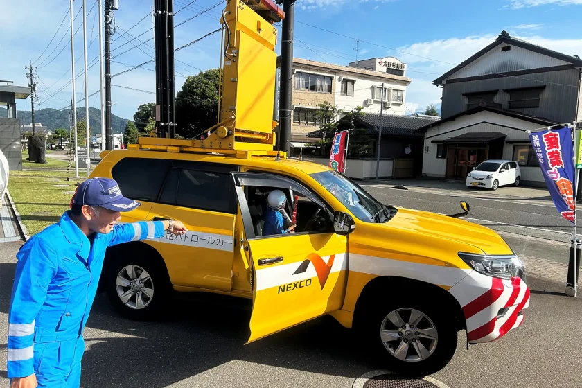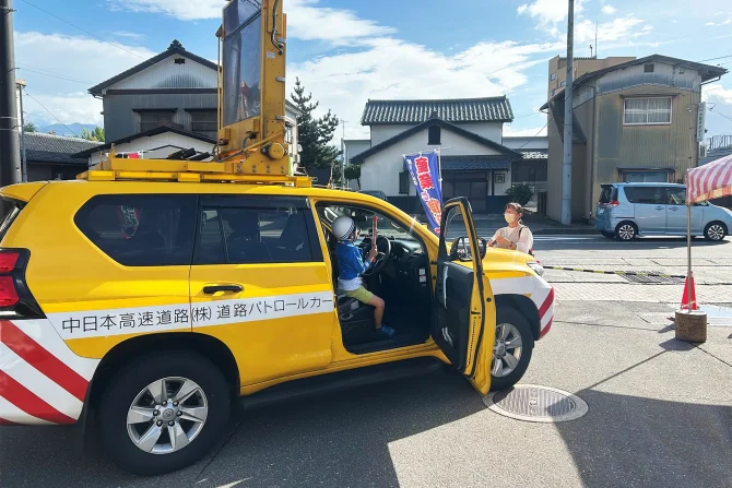 中日本ハイウェイ・パトロール名古屋では、パトロールカー乗車体験と子ども用制服の試着体験を実施。行列ができるほどの人気ぶりでした。「はたらくくるまコーナー」には、ほかにも除雪車やホイールローダー、トレーラーヘッド、高所作業車の同乗走行体験なども行われ、子どもたちがさまざまな車両と笑顔で写真を撮っていることが印象的でした。