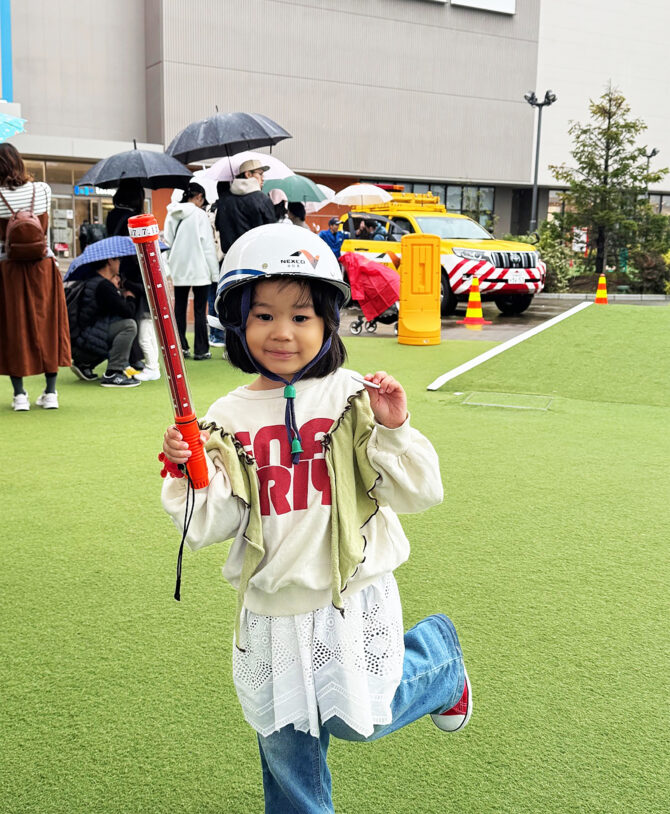 小雨が降るなか、レッカー車や郵便局の車両(トラック・バイク)、高所作業車など、さまざまな“はたらく乗りもの”が勢ぞろいし、イベントがはじまりました。中日本ハイウェイ・パトロール名古屋では、パトロールカー乗車体験と子ども用制服試着体験を実施。開始直後から長蛇の列ができるほど大盛況でしたが、途中から雨足が強くなり、残念ながら乗車体験は中止させていただきました。